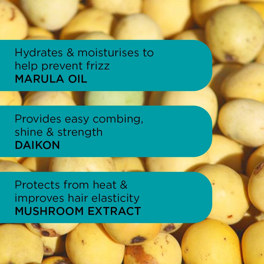 Comienza aplicando desde la raíz para protección contra el calor y desde la mitad del cabello para suavizar. Añade más producto según sea necesario, trabajando hacia las puntas. Evita aplicar en el cuero cabelludo. Estila como de costumbre.