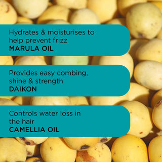 - Natuurlijke ingrediënten: Bevat een mix van actieve extracten van tarwezemelen en daikon en vochtinbrengende oliën van marula en kokosnoot die de gladheid en conditie van het haar optimaliseren.